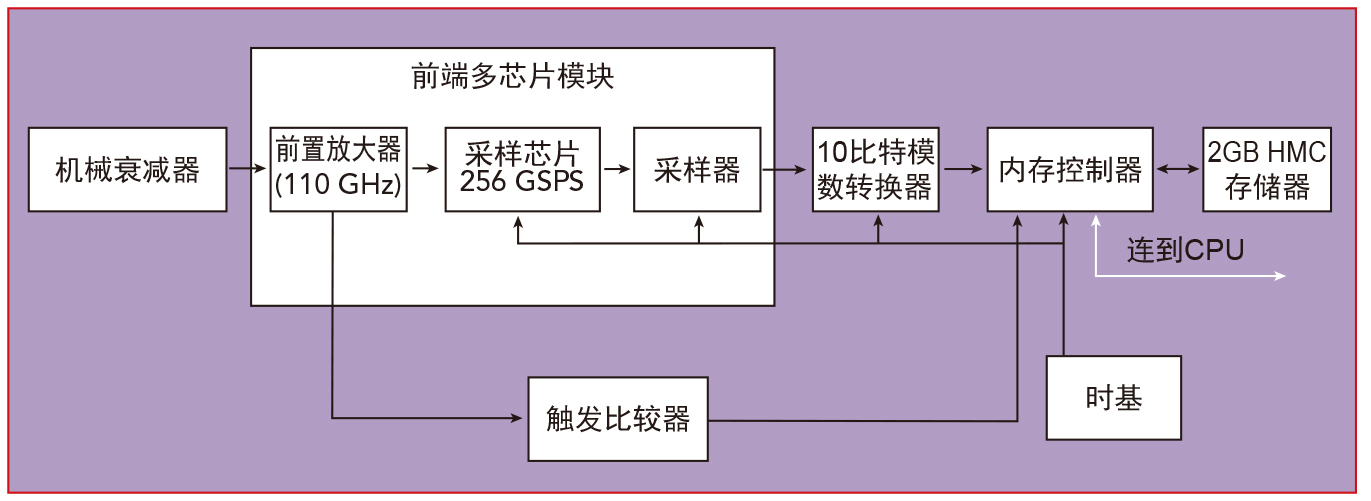 图2 110GHz前端模块 当我们说该前端模块是UXR示波器和其它品牌高端示波器的关键区别之一的时候,我们是说,对于40GHz及更高的实时带宽示波器,其它品牌必须采用折衷技术,无论给这种技术起什么样的名称,本质上都是利用频率交织技术,将信号下变频或滤波到40GHz以下,也就是他们所用的锗硅工艺芯片所能处理的频率范围。在原有芯片组能力的基础上,频率交织技术可以将示波器的带宽加倍,甚至是三倍,这种折衷技术的缺点是,必须使用额外的带通滤波或其它滤波技术,增加了额外的噪声和失真,这些噪声和失真在经过前置放大器时,又被进一步放大,数据采集之后,再用DSP数字信号处理把信号重新拼接在一起,进一步增加了示波器的本底噪声。UXR示波器使用的前置放大器直接覆盖直流到110GHz频率范围,无需使用上面说到的折衷技术,也就是前面无需频率交织技术,后面无需DSP数字信号处理拼接信号,而是和传统示波器一样,被测信号全频段信号直接进入前置放大器。那么,不用频率交织技术,超过40GHz带宽,前置放大器硬件直接支持如此高的频率范围,有什么弊端吗?其中一个弊端就是这种高性能示波器的上市时间会因此被推迟,但这种推迟是值得的,因为性能的提升是令人吃惊的。 信号经过衰减器和前置放大器,接着同时进入采样前端和触发比较器,采样前端和前置放大器一样都是采用磷化铟工艺制作的芯片,这种是德科技独有的技术除了实现110GHz带宽外,也实现了256GSa/s的采样前端,采样前端用的是快进慢出技术,让后面的系统设计变得简单,这也是经典的时间交织(time interleaving)技术,与频率交织技术不同的是,时间交织是通过精心控制振荡器电路板来实现的。采样前端后面,紧接着是ADC(模数转换器),这是一个10比特的模数转换器阵列,每个阵列包括4个10比特模数转换器,每个10比特模数转换器的速率是64GSa/s,比最常见的8比特模数转换器,垂直分辨率提升4倍。经10比特模数转换器量化后的信号被送到内存控制器,这是一款是德科技专门设计的芯片,又称作数据加速芯片,完成大数据量的加速操作,存储器则是使用先进的三维存储技术,也就是HMC存储器技术,存储深度达2G采样点每个通道。触发比较器将触发信息输出到内存控制器,完成触发、滤波、去嵌入等基于硬件实现的操作,甚至支持波形图的绘制,降低后面的FPGA和CPU处理数据的负担,提升示波器性能。内存控制器将数据传送到FPGA,FPGA负责通过PCI-E高速接口与CPU沟通,将测量结果和信号显示在屏幕上。每个110GHz带宽的通道都对应一个采集板,确保四个通道同时运行时,每个通道都是满带宽、满采样率和满存储深度。 该示波器的全新设计为业界树立了新的里程碑如下: • 四个通道同时使用,每个通道可同时达到110GHz带宽 • 本底噪声很低,比如,在10mV/div设置下,仅为210μVrms • 固有抖动低,在1μs/div设置下,仅为25fsrms • 通道间固有抖动低,仅额外增加10fsrms • 系统数模转换有效位高达6.8比特 为什么意义重大? 对于正出现的高达110GHz的毫米波应用,在进行信号分析时,UXR示波器提供了新的手段和视角,直接对毫米波宽带信号进行数字化,然后用专门的后处理应用软件分析,在UXR之前,工程师一般是使用下变频器和几个GHz带宽的中端示波器对毫米波宽带信号进行分析。UXR的精度高达6.8比特有效位,使得像802.11ay这样的高阶调制信号,测量其宽带EVM成为可能。 在高速数字接口行业,随着一代一代新标准的诞生,设计周期的要求越来越短,设计本身越来越接近硬件的极限,因此测试冗余度一直在减少,一致性合规测试也变得愈来愈困难。以前,比特位宽时间较长,要通过规范,最重要的是信号建立时间和边沿时间,如今,通过一致性合规测试,需要预加重、均衡以及严格的模板测试验证,毫伏级的噪声都有机会造成通过和不通过的区别,UXR示波器将自身信号完整性降到最低,包括本底噪声和固有抖动,在10mV/div设置下,其本底噪声仅为210μVrms,而固有抖动仅为25fs,在测试信号眼图时,眼宽更宽,眼高更高,更有信心通过一致性测试,也就是不用担心仪器自身的误差带来的影响。 在太比特和光通信研发领域,下一代技术突破受限于测试设备的限制,高阶调制信号对测量仪器提出更高的要求,包括更高的带宽、更低的本底噪声、更低的通道间抖动、多个通道同时使用,只有同时达到这些要求才能准确解析相干信号的设计。当然,你可以把多个单通道的仪器级联起来实现多通道,这样做不仅仅是费用的问题,更重要的是会带来测量误差,级联起来的仪器,其通道间抖动指标下降,会成为精确测量相干信号的障碍。UXR一台示波器同时支持四个高带宽通道,而且通道间的抖动指标是飞秒级的,使得以前做不到的测量,现在可以做到了。 UXR示波器的技术突破,不是单点突破,也不是两点突破,而是系统级的全面突破,带宽、水平采样率、垂直分辨率和通道数同时达到业界最高水平。是德科技独有的磷化铟半导体工艺和专有芯片让其自身信号完整性达到巅峰,无需借助频率交织等折衷技术,因此也没有折衷技术带来的各种问题。 是德科技