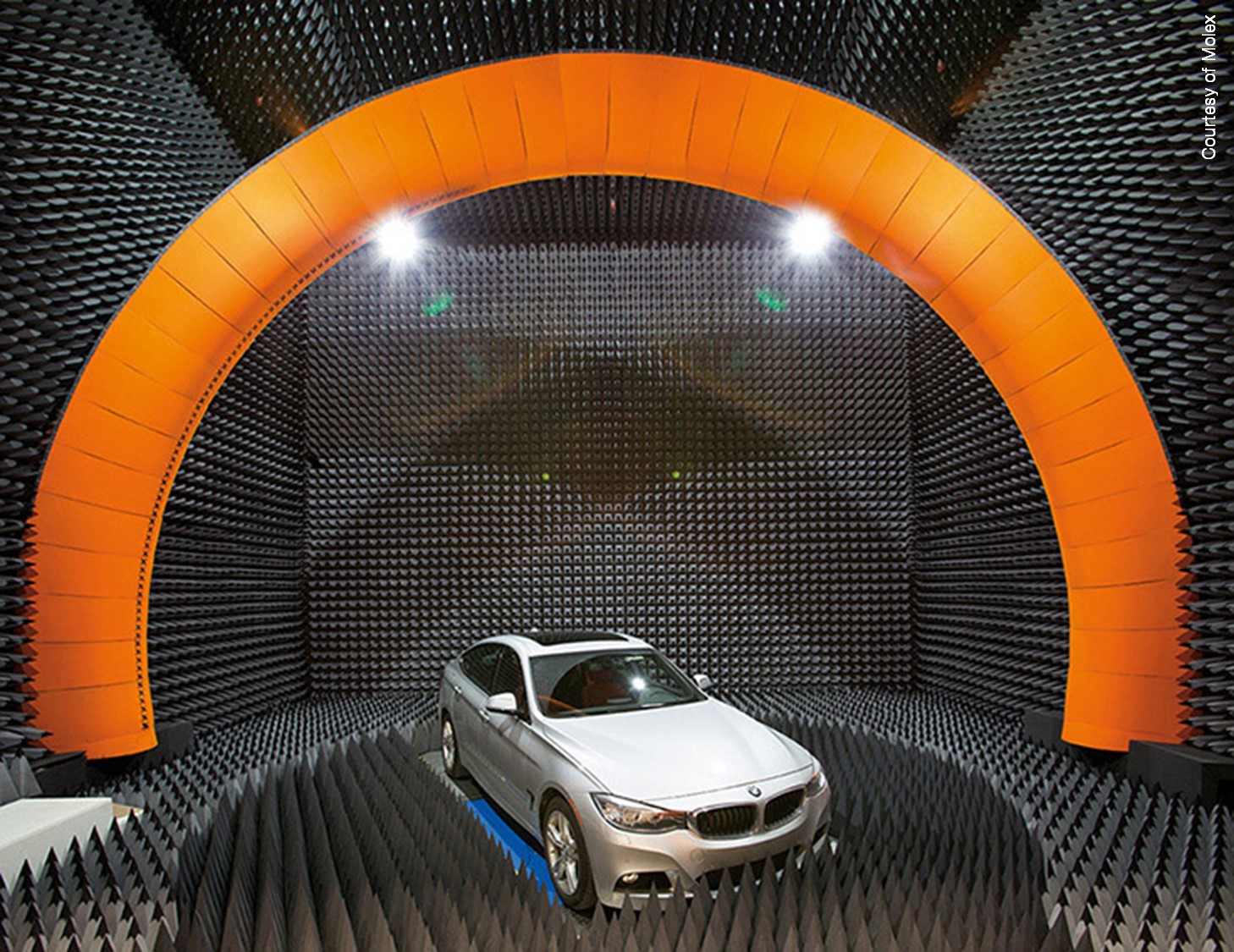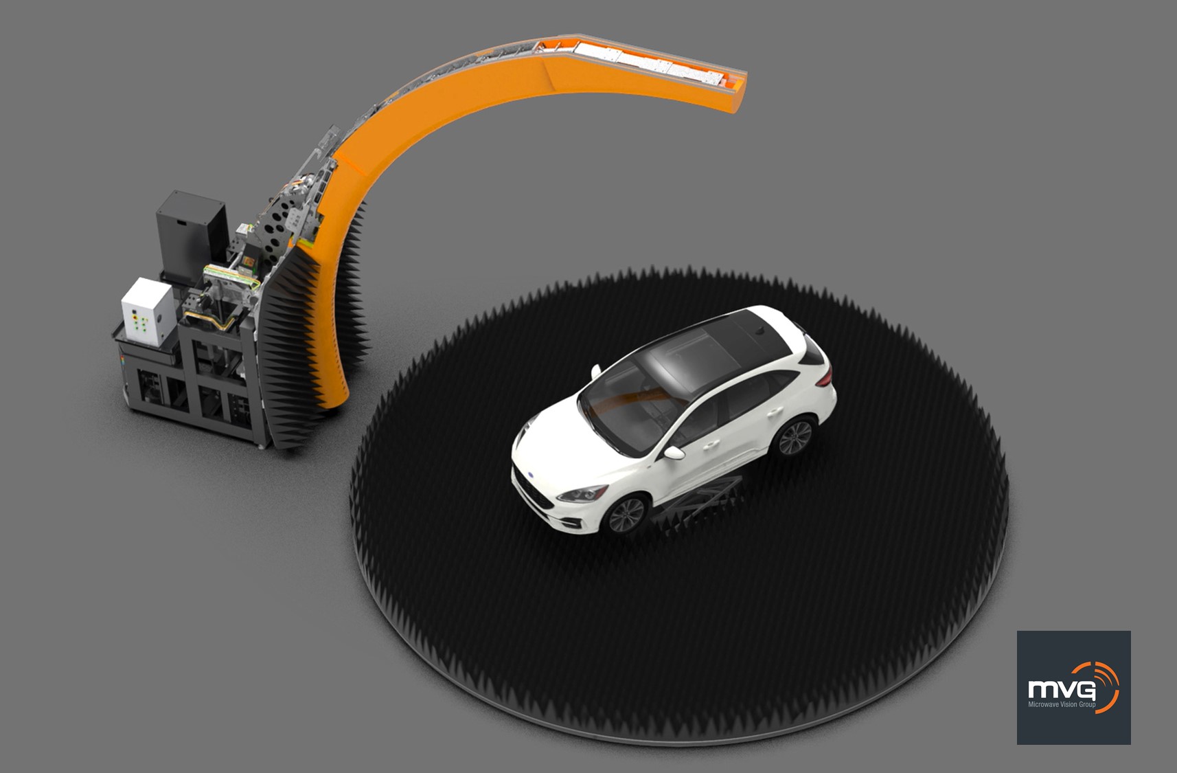 早期的天线形式比较简单,从外观上一般可以看得到,如鲨鱼鳍天线等。但现在的汽车天线更多是进行了一些集成,从外观上很难看到,比如放在后视镜里的天线、雷达天线、后玻璃天线。这给测试造成了很大困难,因为看不到的情况下,没有办法对天线进行完整和准确的测试。 因为无法取出天线,所以在测试时要和整车一起进行测试。同样的模块,如形状发生变化或车的外形发生变化时,整个天线工作的性能也会发生一定变化,这就要求我们在做汽车天线测试时要和车体一起进行测试。 汽车天线测试方法 汽车天线测试有不同的方式,一种方式是用电缆连接汽车天线进行测试,这种方式叫做无源测试,它是一种很简单的方法,缺点在于它测的是天线本身,实际工作中汽车天线是和收发信机连接的,要得到完整的真实的测试结果就需要进行OTA测试,OTA测试是更强调真实天线工作状态的测试,会把天线和收发信机连接之后进行测试。 OTA天线测试分为近场测试和远场测试。远场测试把待测物体和馈源距离做得足够远,这样测试结果就是实际结果。近场测试不需要待测物体和馈源保持足够远的距离,能在一个小环境中完成测试,然后进行从近场到远场数据的转化,得到远场的结果。 远场测试需要找一个开阔的室外场地。另外,当做一些特定的测试比如GPS时,这个距离会更远。对于现在的汽车来讲,各种复杂天线在汽车上越来越多,这样简单的远场已经越来越难以完成测试任务了。 还有一种测量方法叫做紧缩场,它是一种非直接的远场测试。这种测试是点对点的,所以如果想要完成整个车的3D方向图测试的话,就需要对车辆进行旋转,但这是比较难的,所以它并适合汽车天线测试。 MVG的汽车天线测试解决方案 MVG现在主要做的是球面近场测试系统,它是用一个测试环(下图橙色部分)将汽车包裹,在汽车旋转时完成整个3D测试,测试完成之后,通过数据进行远近场之间的转换,来得到最后的测试结果。在测试结果基础上可以加载软件仿真,提供了测试系统的可扩展能力和灵活能力。它的占地面积小很多,也是比较现实可靠的一种测量方法。