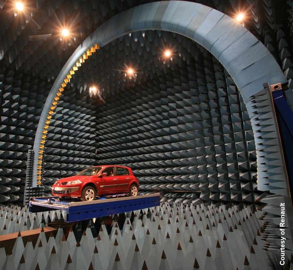 转台专门针对汽车测试进行了设计,可以前后移动和升降,汽车可以直接放置在转台上面进入暗室,不需要把吸波海绵从地上挪走,缩短了测试时间,也简化了测试步骤。 下图是MVG在德国伊尔梅瑙工业大学完成的测试系统,相对小一点,内部半径在4米左右,环测试频率分两部分,一个是低频部分,一个是中高频部分。